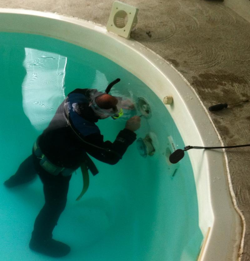 Underwater visual pool inspection - drains, skimmers, lights, return and fountains